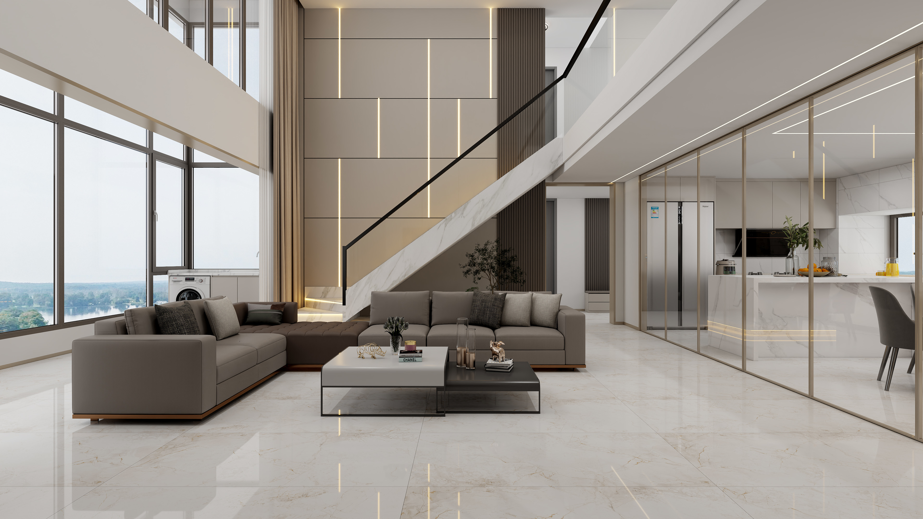 型 号:VJ715Y1269 寒江雪 颜 色:灰色 尺 寸:750×1500mm 系 列:纯平超耐磨通体岩板瓷砖(升级版) 适用空间:客厅、卧室、酒店大堂等